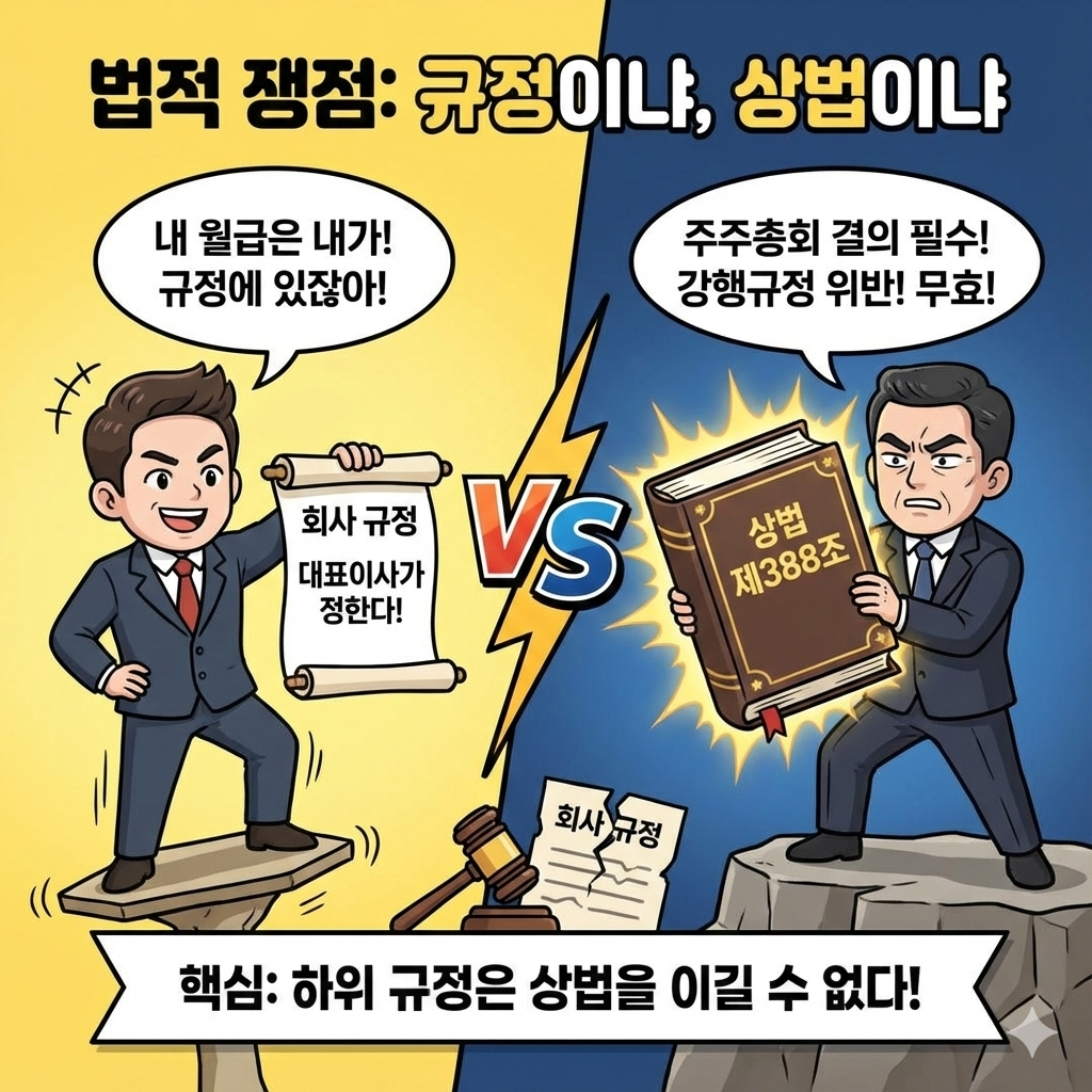 회사: "상법 제388조는 주주총회에서 정하라고 했다. 하위 규정이 상법을 어기면 무효다!"