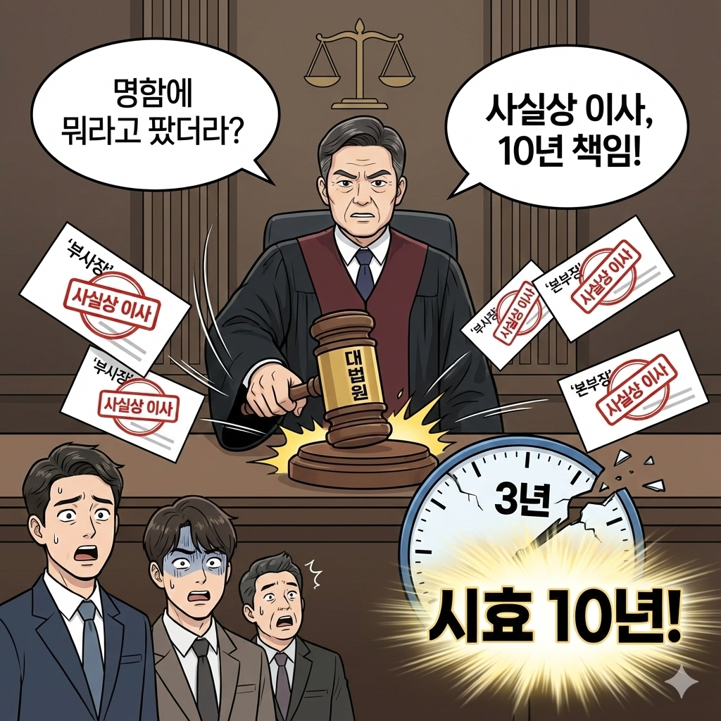 "당신들이 스스로 부사장, 본부장이라고 칭하고 다녔지 않나? 그렇다면 상법 제401조의2에 따라 당신들은 '사실상 이사'다. 이 책임은 법이 정한 특별한 책임이니, 3년짜리 불법행위 시효가 아니라 10년짜리 일반 시효가 적용된다."