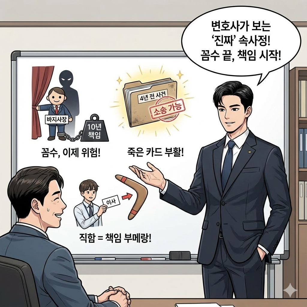 1. "바지사장" 내세우는 꼼수, 이제 위험합니다. 가끔 보면 실제 오너는 뒤로 빠지고 월급쟁이 사장 앉혀놓은 뒤, 뒤에서 "김 상무, 그거 그냥 저기로 보내"라고 지시만 하는 경우가 있습니다. 본인은 기록 안 남기려고요. 예전에는 이게 어느 정도 통했습니다. 하지만 이제는 '업무집행지시자'로서 상법상 책임을 져야 하고, 그 책임 기간도 10년으로 늘어났습니다.