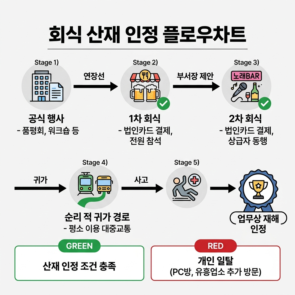 일반인의 상식과 법리가 충돌하는 지점이 바로 여기입니다. 상식적으로 생각하면, 회사 행사를 마치고 회사가 주관한 회식에서 술을 마시고 집에 가다 사고를 당했으니 당연히 업무상 재해입니다. 하지만 법적으로 따지면, '자발적 참석'이라는 형식적 틀과 '개인 과실'이라는 방패막이가 버티고 있었던 것이죠.